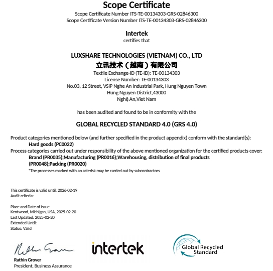 祝賀越南立訊科技有限公司2025年快速通過GRS認證