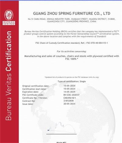 祝賀廣州斯普睿家具有限公司2024年快速通過BV-FSC森林認證